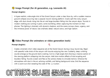 | 1. 주제 생성 | ChatGPT | 벤치마킹 영상 캡처 후 명령어로 주제와 프롬프트 생성 "위 사진은 유명한 관광지에서 쓰나미가 일어나는 쇼츠의 한 장면인데, 해당 쇼츠와 비슷한 새로운 쇼츠를 만드려고해. [장소]에서 [자연재해]가 일어나는 쇼츠 주제 5개를 추천해줘." "[숫자] 주제로 쇼츠를 제작하려 하는데, 관련된 이미지 프롬프트와 영상 프롬프트를 영어로 만들어줘." "해당 영상에 어울리는 극적이고 현실적인 [숫자]초짜리 효과음을 제작하기 위한 일레븐랩스용 프롬프트를 만들어줘.“ |